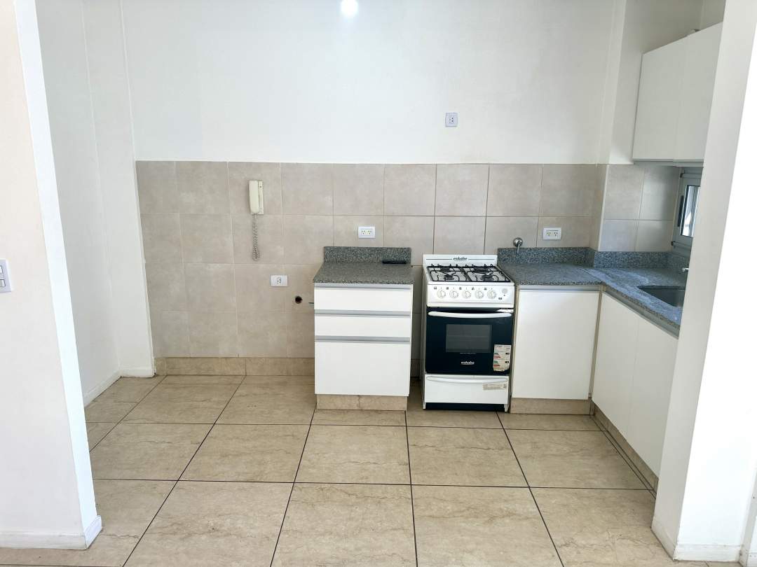 Cocina americana y equipada con muebles sobre y bajo mesada, conexión para lavarropas (3,78 x 1,75 m).
